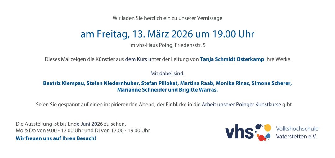 | Bemerkungen | Bitte mitbringen: Leinwände in gewünschter Größe, Acrylfarben, Pinsel in unterschiedlichen Größen und Formen, Spachtel, Zeichenkohle, Bleistift, Abreißpalette oder Alufolie, Einweghandschuhe (wer möchte), Küchenrolle |